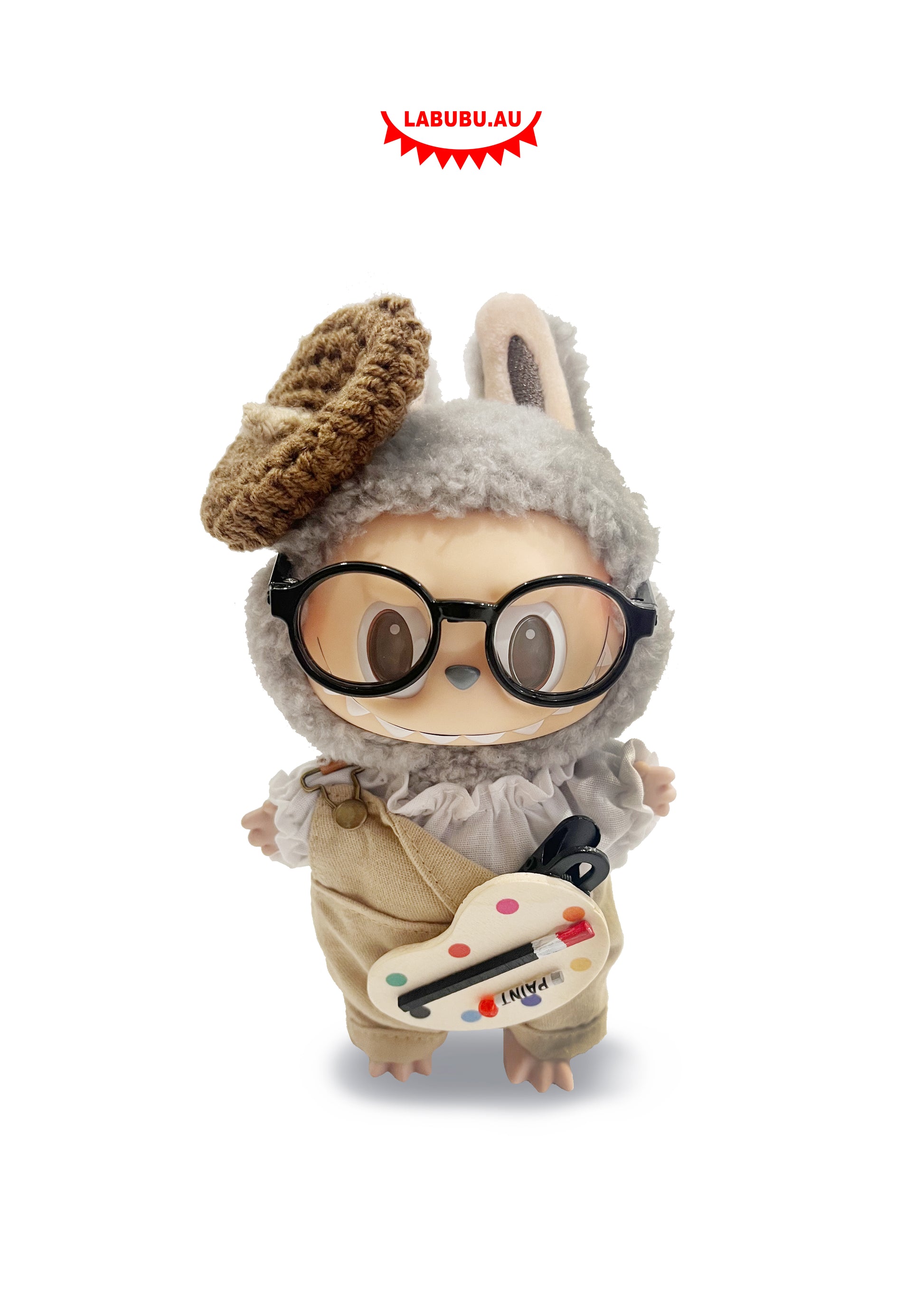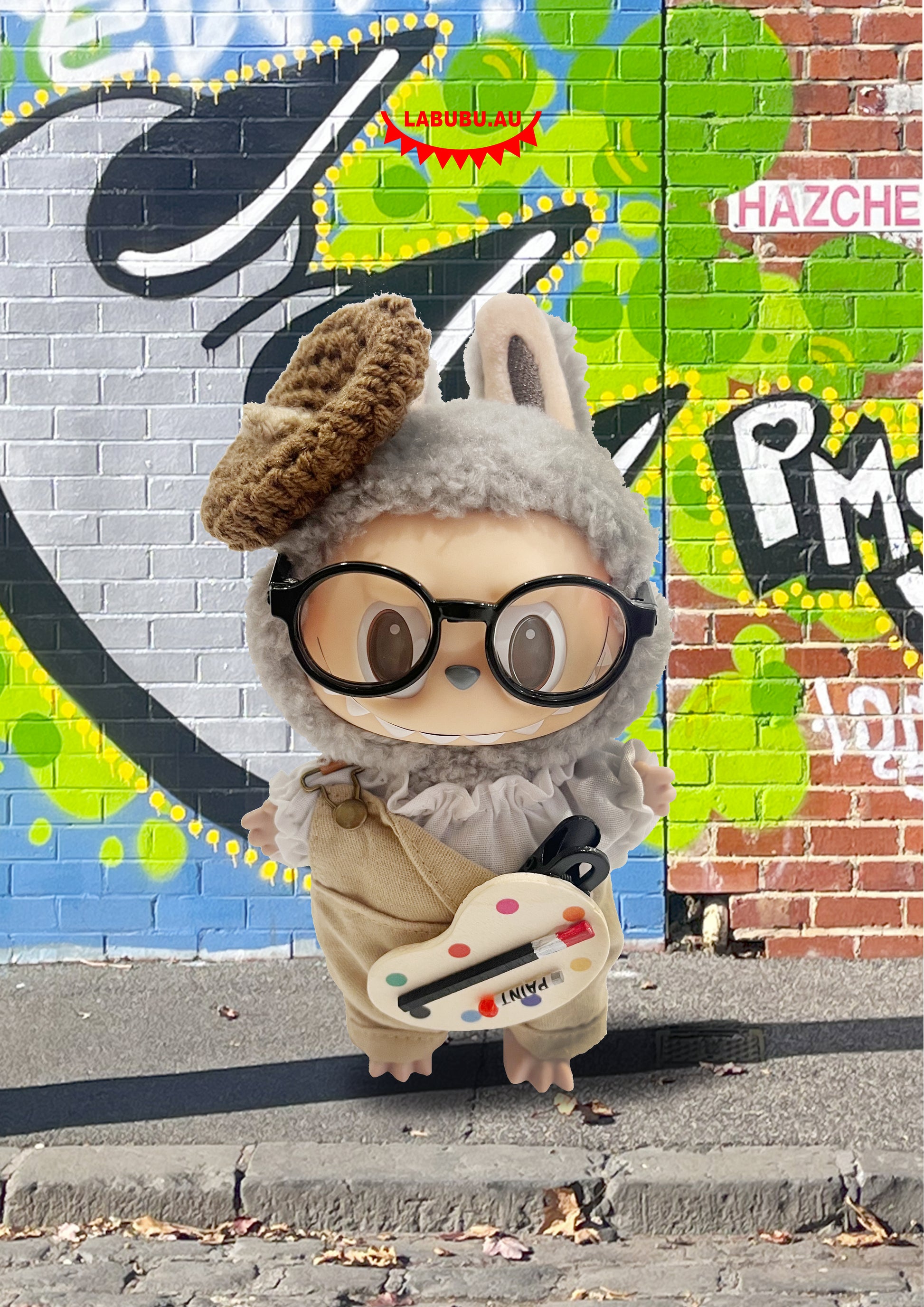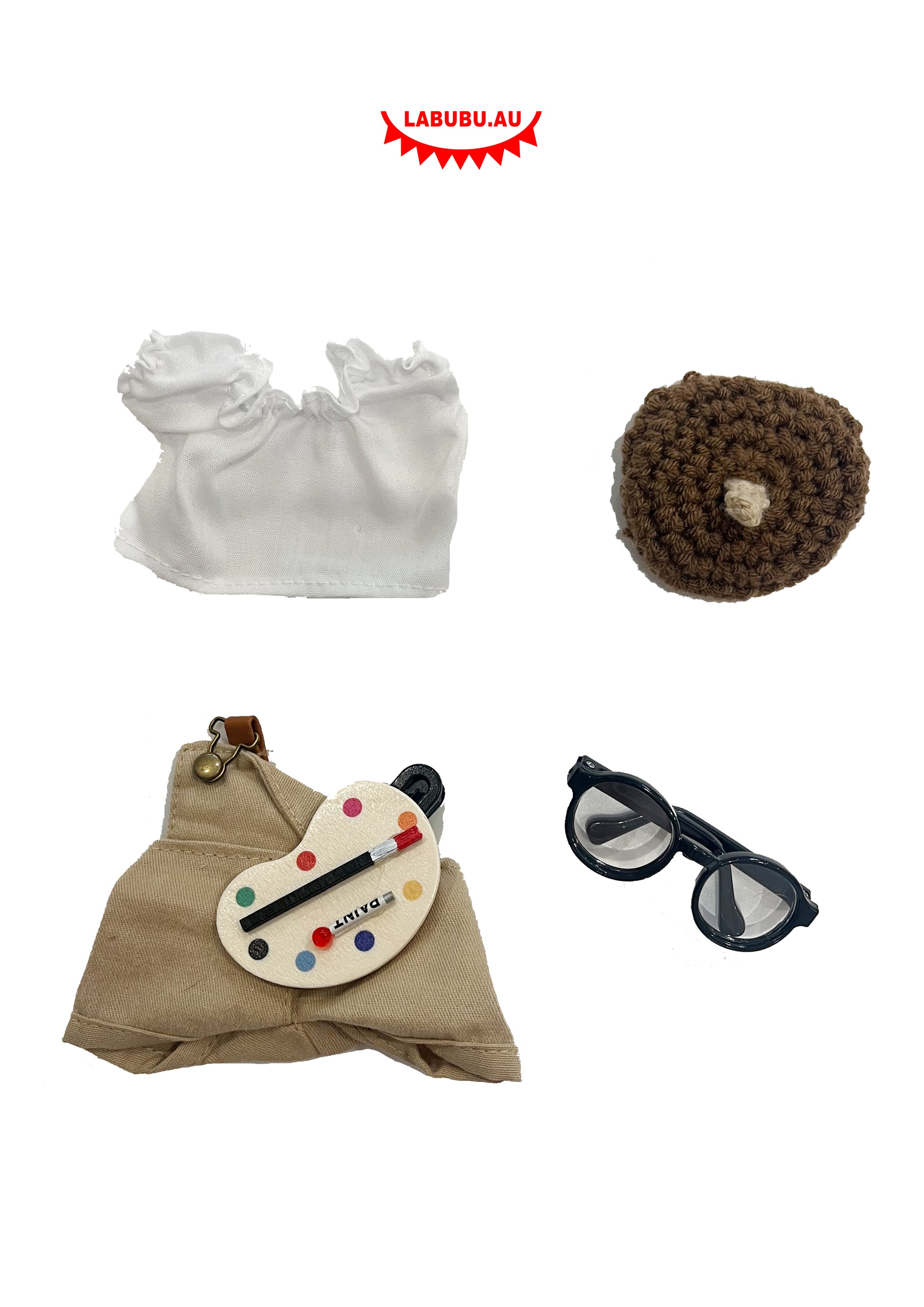 Labubu outfit Artist Style • Painter’s Hat + Frill Tee + Khaki Overalls + Black Glasses + Sketch Board
