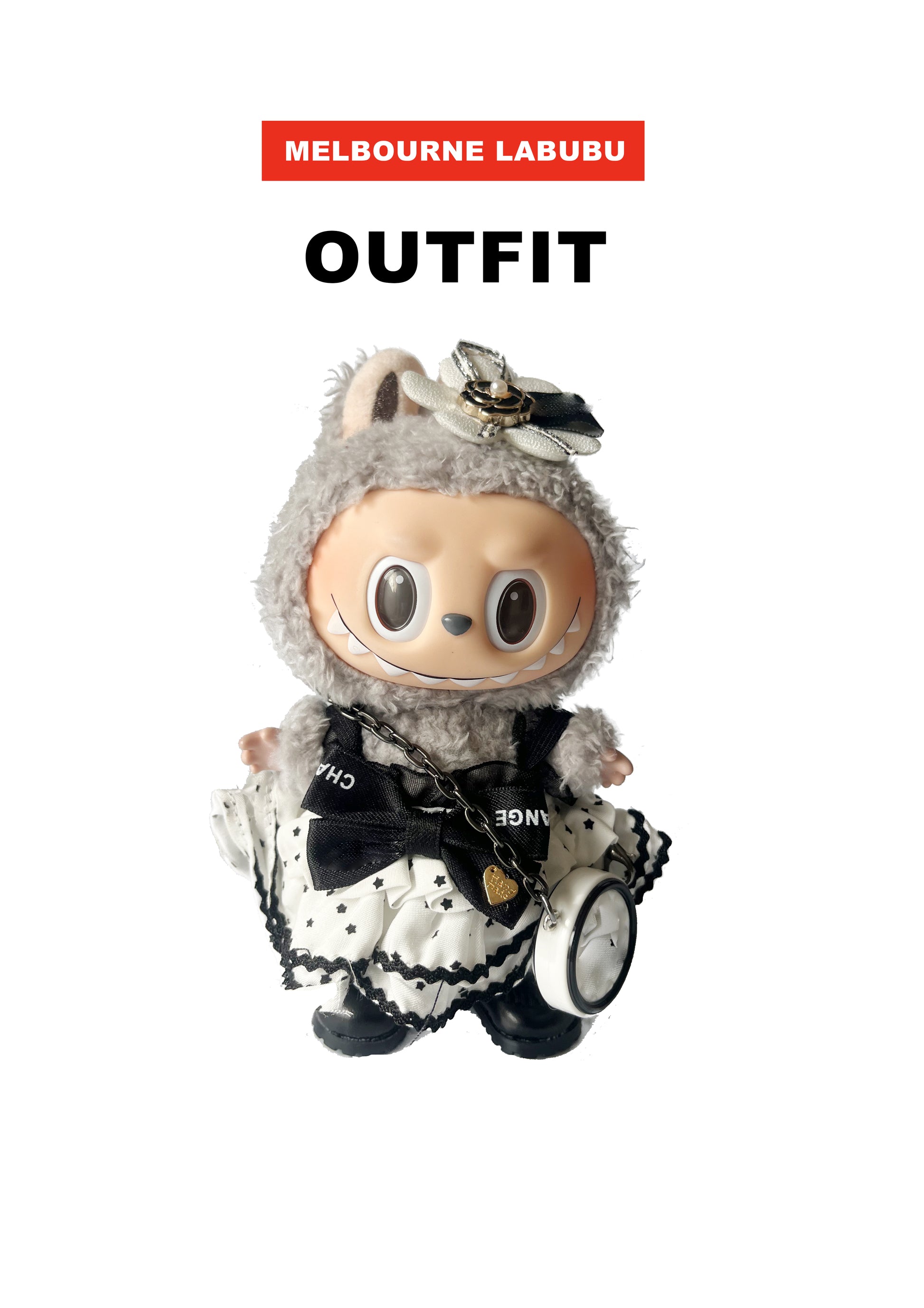 This elegant outfit set is designed for Labubu dolls and features a black and white layered tulle dress with a matching headdress. The look is completed with a round crossbody bag and black princess-style boots, adding a charming and graceful touch to your figure collection.