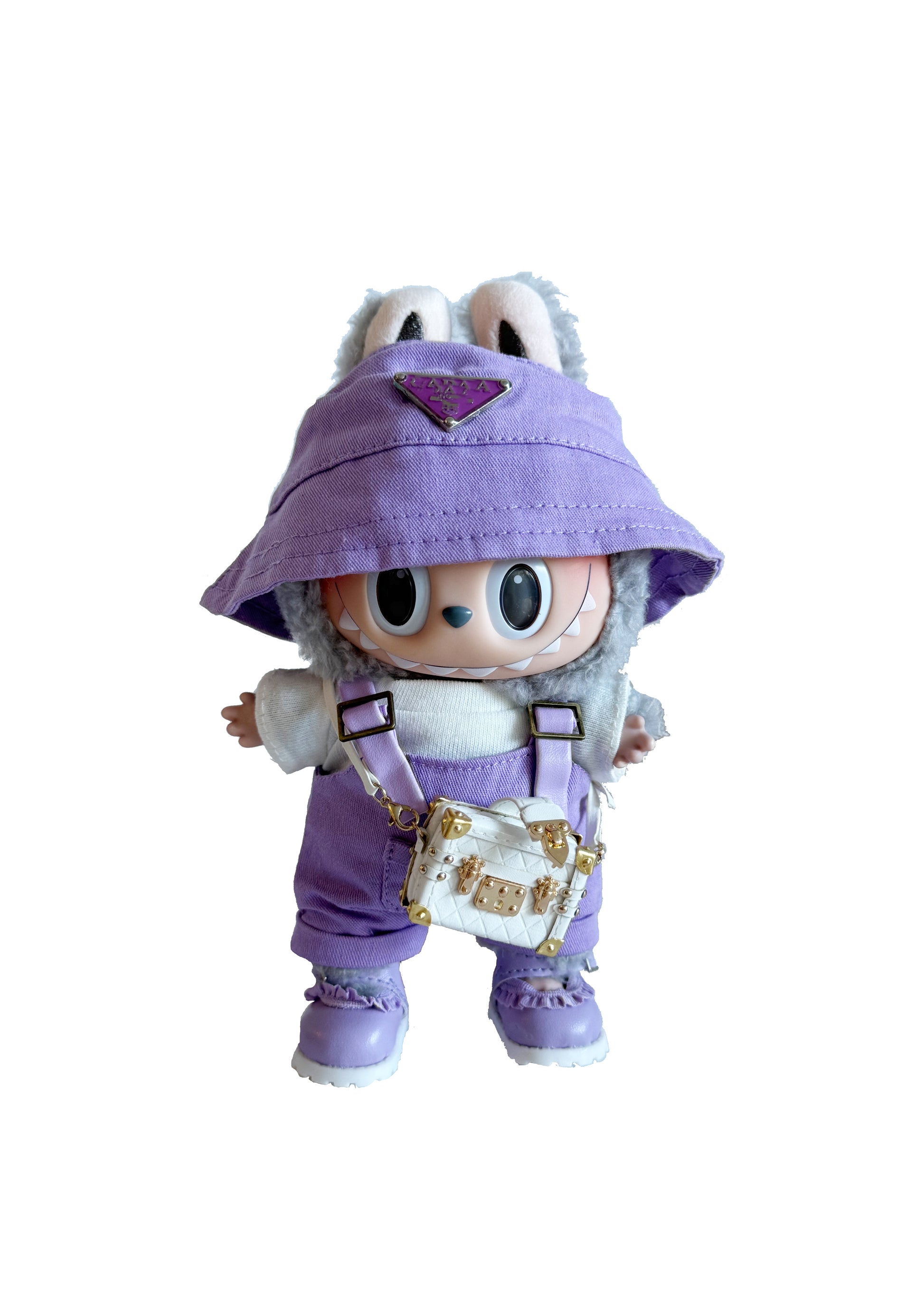 Labubu Outfit Purple Style Purple Bucket Hat + Overalls + Box Bag + Leather Shoes