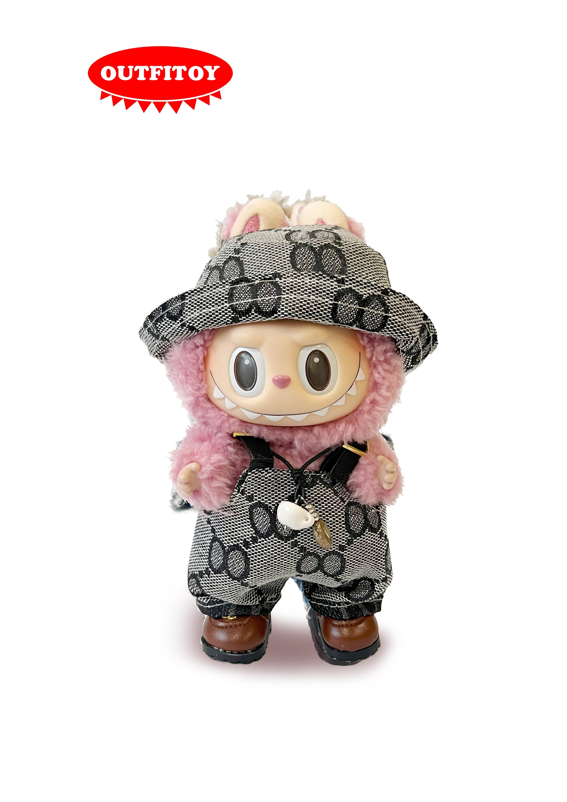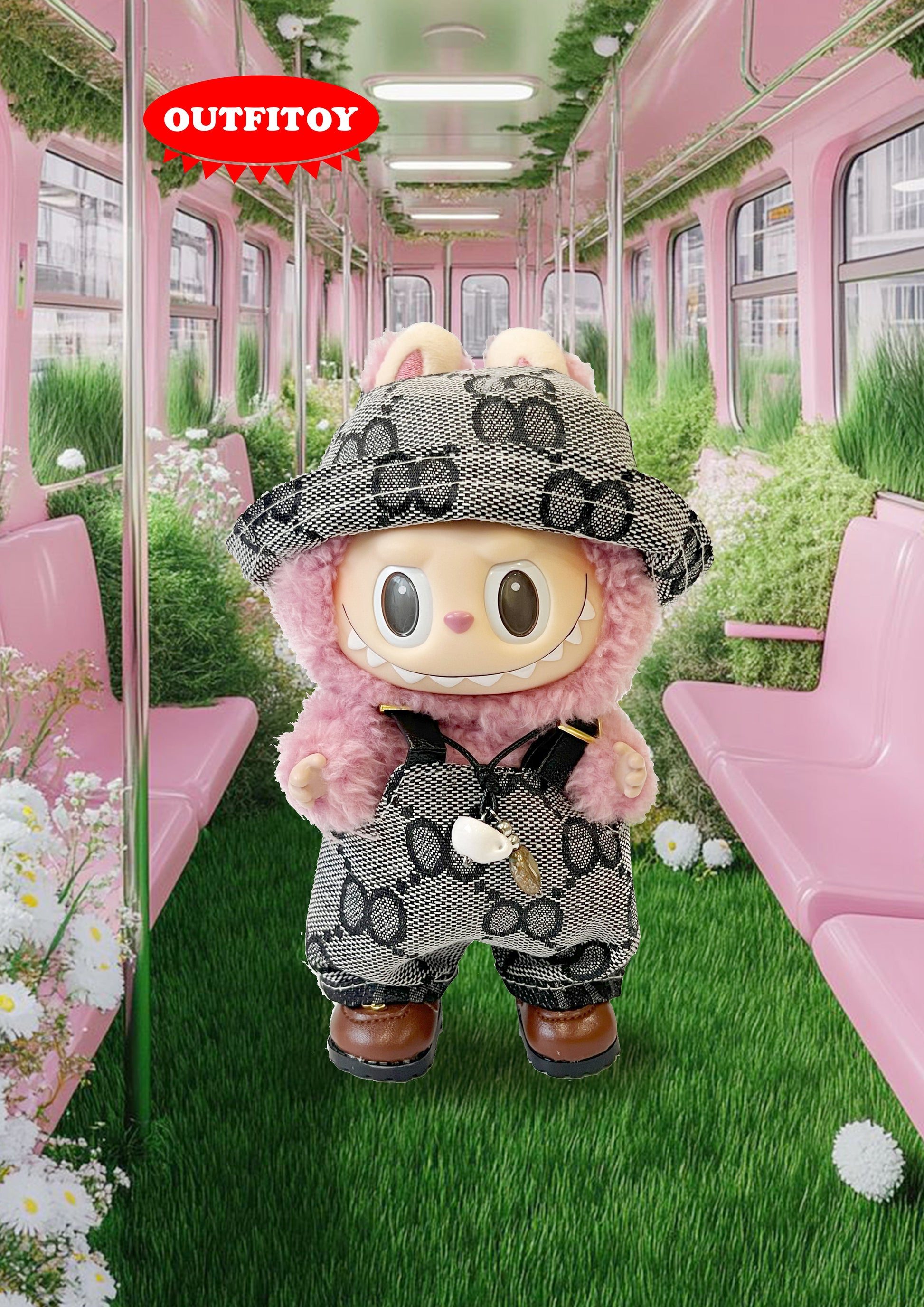 Labubu Outfit|Retro Black & White Pattern Overalls + Fisherman Hat